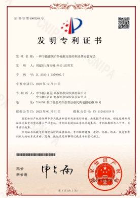 近日,中節(jié)能實(shí)業(yè)發(fā)展有限公司下屬嘉興公司自主申報的《一種節(jié)能建筑戶外地板安裝結(jié)構(gòu)及其按照方法》的技術(shù)成果通過國家知識產(chǎn)權(quán)局審查,被授予發(fā)明專利權(quán)。