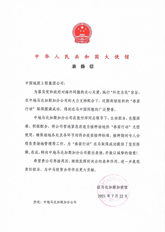 中國(guó)地質(zhì)收到中國(guó)駐馬達(dá)加斯加大使館表?yè)P(yáng)信 |