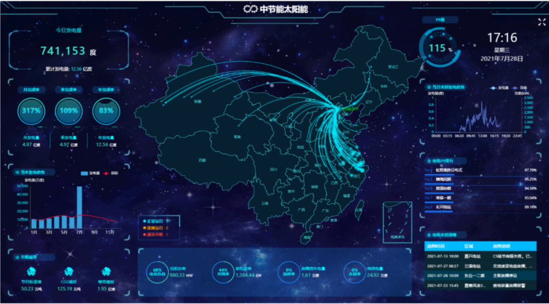 “節(jié)能云平臺”,開啟智能制造智慧運營新時代 “節(jié)能云平臺”讓生產(chǎn)管理、電站運維、安全保障和投資分析變得簡單方便,讓電站更加智慧、友好。依托“工業(yè)互聯(lián)網(wǎng)平臺”構建中節(jié)能智能制造體系,持續(xù)踐行光伏制造智能化應用。實現(xiàn)無紙化生產(chǎn),產(chǎn)能提升50.7%、效率提高15%;271臺設備聯(lián)網(wǎng),數(shù)據(jù)采集22080個,10305萬條數(shù)據(jù)聯(lián)網(wǎng)、關鍵裝備互聯(lián)100%。依托“智能運維平臺”構建中節(jié)能智慧運維體系,開拓能源互聯(lián)網(wǎng)模式。平臺規(guī)劃226項系統(tǒng)功能、161項分析模型、89個KPI指標;已接入376臺主設備、6675數(shù)據(jù)采集點、9555萬條數(shù)據(jù)聯(lián)網(wǎng),實現(xiàn)若干個相鄰電站集中調度,實時監(jiān)測每個電站的運營情況,減輕一線運維人員勞動量,電站運維效率提升50%、日發(fā)電量提升約6%。 “節(jié)能云平臺”已全面應用于中節(jié)能太陽能華東區(qū)31個電站,其中包括8個分布式電站,23個集中式電站。截至目前,監(jiān)測到華東區(qū)今年的發(fā)電量已達到9.75億度電,相當于節(jié)約標準煤39.01萬噸、等效植樹1.51億棵、二氧化碳減排97.23萬噸、二氧化硫減排2.93萬噸。