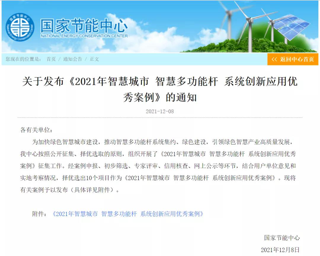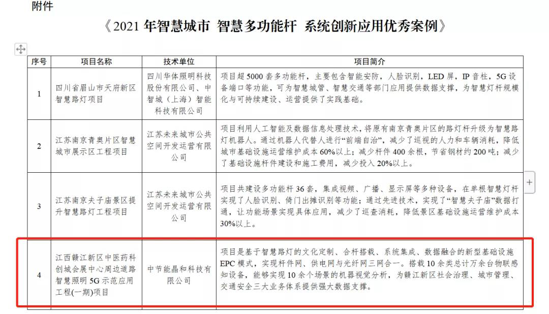 12月8日,國家節(jié)能中心官網(wǎng)發(fā)布《2021年智慧城市 智慧多功能桿 系統(tǒng)創(chuàng)新應(yīng)用優(yōu)秀案例》,江西公司下屬子公司中節(jié)能晶和科技有限公司“江西省贛江新區(qū)中醫(yī)藥科創(chuàng)城會展中心周邊道路智慧照明5G示范應(yīng)用工程(一期)項(xiàng)目”,經(jīng)國家節(jié)能中心專家評價篩選,結(jié)合實(shí)地考察結(jié)果,專家組終審確認(rèn)成功入選。此次國家節(jié)能中心經(jīng)過現(xiàn)場核實(shí)、情況復(fù)查、信譽(yù)核查及公示等環(huán)節(jié)僅評選出10個符合標(biāo)準(zhǔn)的優(yōu)秀案例。