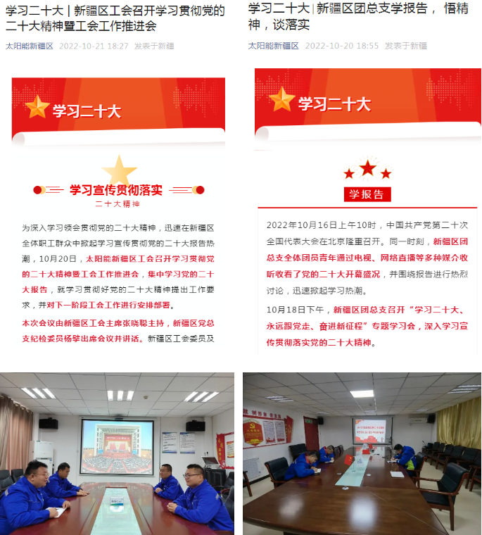 新疆區(qū)黨總支堅決做到高起點謀劃、高質(zhì)量推進、高標準貫徹,認真落實歸口意識,對照集團公司、太陽能公司黨委深入學習宣傳貫徹黨的二十大精神方案要求,依托愛黨愛國愛企學習教育活動,開展“貫徹黨的二十大·閱享新征程”、“禮贊新時代·奮進新征程”、“我和家人一起感悟二十大”、“二十大快問快答”“我把黨的二十大講給你聽”“曬曬二十大學習筆記”等系列活動,切實把學習宣傳貫徹黨的二十大精神和“科技創(chuàng)新年”、推動“三新兩保一推進”目標任務結(jié)合起來,忠實踐行讓天更藍,讓水更清,讓世界更美好的愿景,全方位、多角度地展示大區(qū)工作成效,以防風險、保安全、護穩(wěn)定、促發(fā)展的新成效為中國式現(xiàn)代化建設貢獻力量。