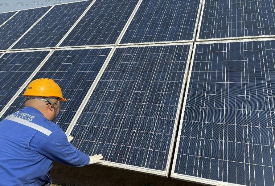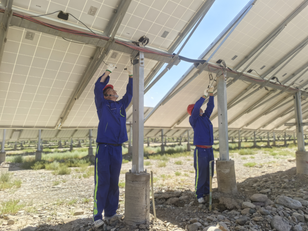 太陽能肅州電站運(yùn)維人員正在調(diào)節(jié)光伏支架角度
