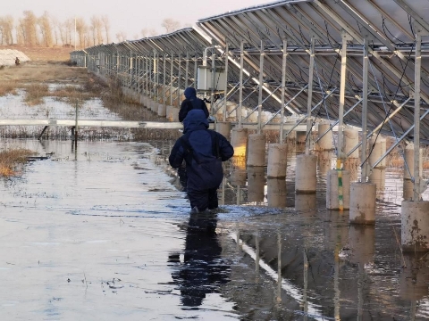 項目并網(wǎng)以后往往得花更多的時間去維護發(fā)電設(shè)施,這就要求運維人員將已經(jīng)損壞的設(shè)備替換下來,以保證整個系統(tǒng)的正常運行。自8月份以來,突如其來的三場臺風(fēng)給設(shè)備安全穩(wěn)定運行帶來嚴(yán)峻考驗。進入電站的必經(jīng)之路已被大水淹沒,根本看不到路在哪里,所見之處,都是積水,多處道路已變成深水區(qū),運維人員沒有退縮,“沒有路也要創(chuàng)造路,就算蹚也得把設(shè)備送進去”。于是,運維人員便經(jīng)過深水區(qū)運送設(shè)備,濕透半截的褲管是不懼臺風(fēng)影響最好的證明。地面積水嚴(yán)重,而光伏組件高度大多超過3米,被水浸泡過的地面無法固定絕緣梯,這給運維人員維護發(fā)電設(shè)備制造了嚴(yán)重障礙,檢修設(shè)備難度大大增加,但這依然阻擋不了運維人員進行設(shè)備運維的決心。面對地面無法固定梯子的困境,運維人員紛紛化身“智多星”,群策群力,出謀劃策,最后決定在絕緣梯頂端加裝掛鉤,再用頂端的掛鉤懸掛在光伏支架上進行維護,解決運維難題。 氣溫驟降,寒風(fēng)颯颯;不懼嚴(yán)寒,站好每一班崗。 由于太陽能華北區(qū)吉林片區(qū)地理位置特殊,常年伴有天氣轉(zhuǎn)涼的跡象,在寒冷的天氣下工作已經(jīng)是運維人員的工作常態(tài),但是在零下30-40度的嚴(yán)寒氣溫下進行設(shè)備巡檢工作,還是給運維人員帶來了極大的挑戰(zhàn)。在巡檢現(xiàn)場,經(jīng)??梢钥吹椒鲈谠O(shè)備上面的手凍得通紅,已經(jīng)變得僵硬。嚴(yán)重的時候甚至很難進行正常的維護工作,回暖也需要好一陣子??墒菚r間就是發(fā)電量,設(shè)備提前一分鐘維護好,我們就多發(fā)一度電。光伏廠區(qū)嚴(yán)禁煙火,于是運維人員只能用體溫取暖的方式,將自己的手揣在衣服里貼著皮膚來進行緩解,只有這樣才能既保證安全,又能將設(shè)備檢修故障盡快完成。 并網(wǎng)在即,關(guān)卡重重;盡心盡力,發(fā)揮最大的價值。