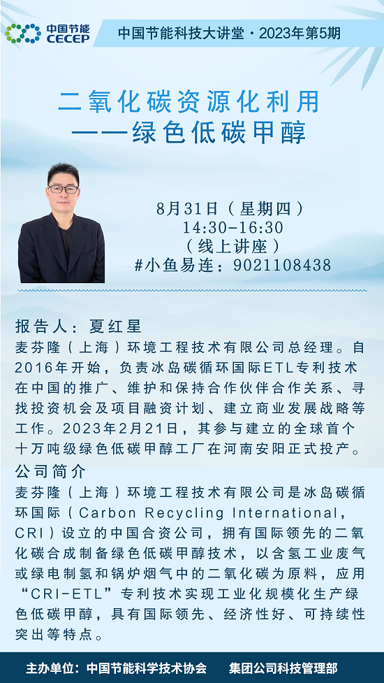 為加強(qiáng)綠色低碳技術(shù)交流,促進(jìn)戰(zhàn)略性新興領(lǐng)域和行業(yè)前沿領(lǐng)域產(chǎn)業(yè)技術(shù)合作,集團(tuán)公司科技管理部、中國(guó)節(jié)能科協(xié)特邀請(qǐng)麥芬?。ㄉ虾#┉h(huán)境工程技術(shù)有限公司(以下簡(jiǎn)稱麥芬隆公司)總經(jīng)理夏紅星先生于2023年8月31日作科技大講堂專(zhuān)題講座。現(xiàn)將有關(guān)事項(xiàng)通知如下: